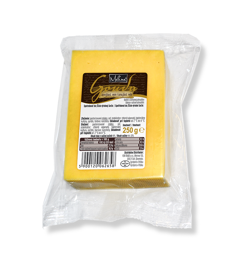 Goudu vyrába veľa výrobcov, existuje v rôznych variantoch a tiež má rôzne stupne zrelosti. Tá od Meliny je vyrábaná z pasterizovaného kravského mlieka, pričom obsahuje 48 % tuku v sušine. Prírodný, polomäkký syr Gouda holandského typu s tenkou žltou kôrou si môžete dopriať v podobe 250 g hranola, ktorý sa nachádza v tepelne izolovanom balení čiernej farby.